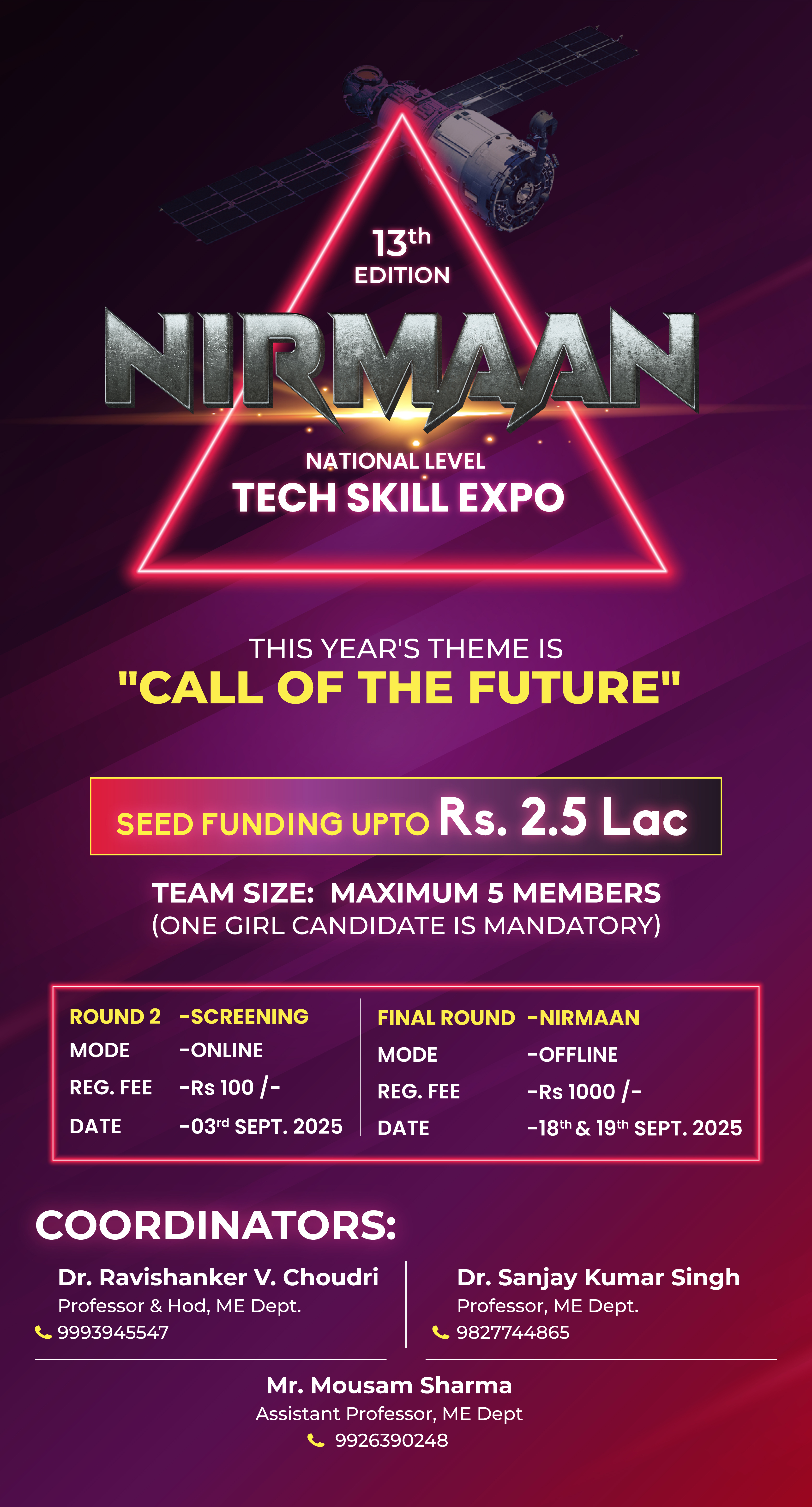 NIRMAAN National Tech Skill Expo: XIII Edition, is one of the most remarkable technical events of this year in Central India. We request you to kindly grace us with your benign presence in this mega event, I am sure this will boost the morale of the participants to open new avenues for them and their innovations.